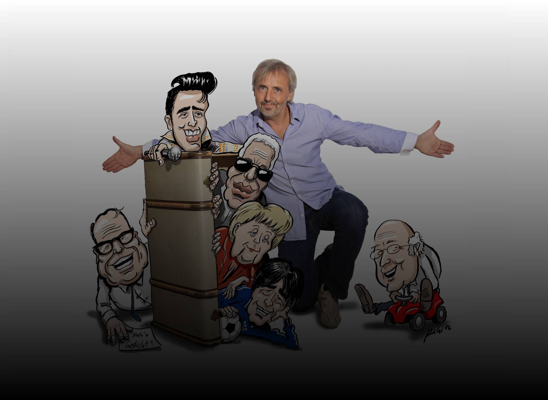 Promis aus Sport, Politik und Showbiz hat er im Gepäck und bietet eine humorvolle ,niveauvolle Unterhaltung für jeden Anlass. Von Boris Becker bis Dieter Bohlen, Angela Merkel bis Kohl, Gesangsparodien von Udo Lindenberg bis Elvis! Weit über 40 Promistimmen interpretiert er täuschend echt in schneller Abfolge. Sein Heinz-Erhardt-Programm ist etwas ganz Besonderes, da er den Altmeister von aktuellen Promis neu interpretieren lässt. Der Entertainer begeistert immer wieder bei privaten Festen genauso wie zu großen Firmengalas oder als Moderator mit witzigen Einlagen. Ein vielseitiger Künstler, der auch die kleinen Zuschauer als Puppenspieler begeistert.