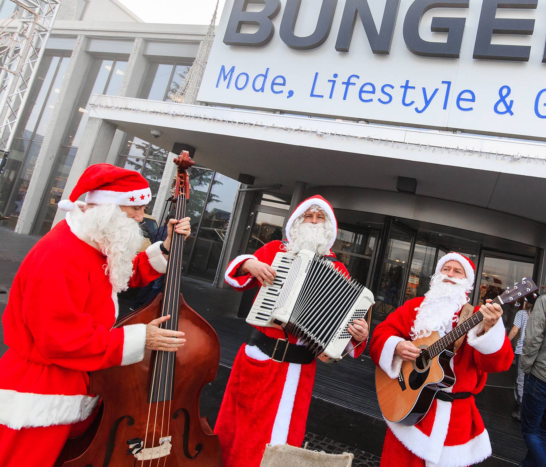 Die Walking Santas treten als Trio auf. Auch ein Quartett mit zusätzlichem Cajon-Spieler ist möglich.