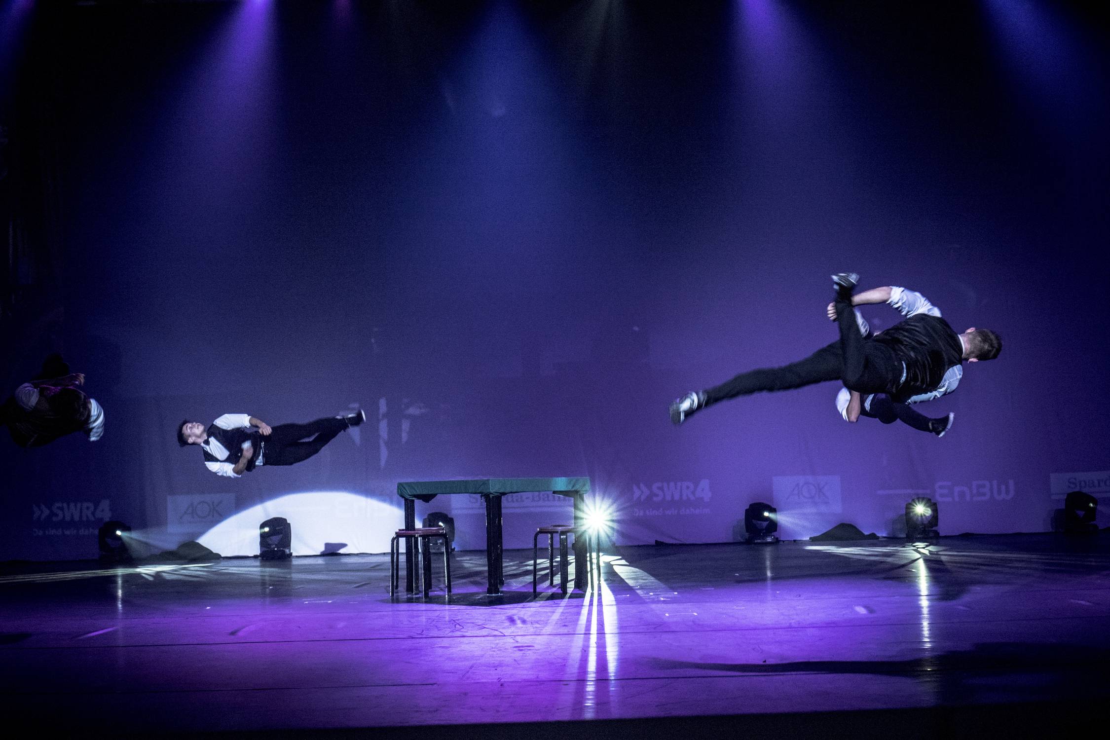 Die Tricking Show tritt standardmäßig mit vier Artisten auf. Je nach Anlass und Kundenwunsch sind 2-6 Performer problemlos möglich. Sprechen Sie uns für Beratung gerne an, wir benötigen 5x5 m Platz auf der Bühne für unsere Sprungelemente, sind jedoch flexibel in der Planung.